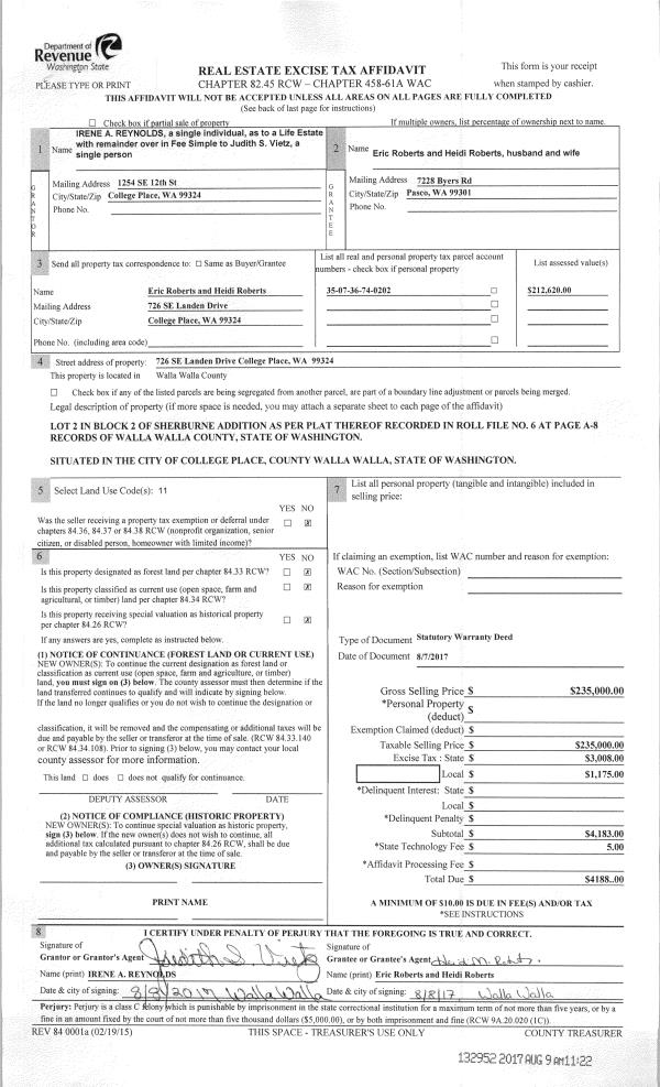 | 1 | 08/09/2017 | SWD | STATUTORY WARRANTY DEED | REYNOLDS IRENE A LIFE ESTATE | ROBERTS ERIC & HEIDI | | | $235,000.00 | 132952 | 2017-06107 |