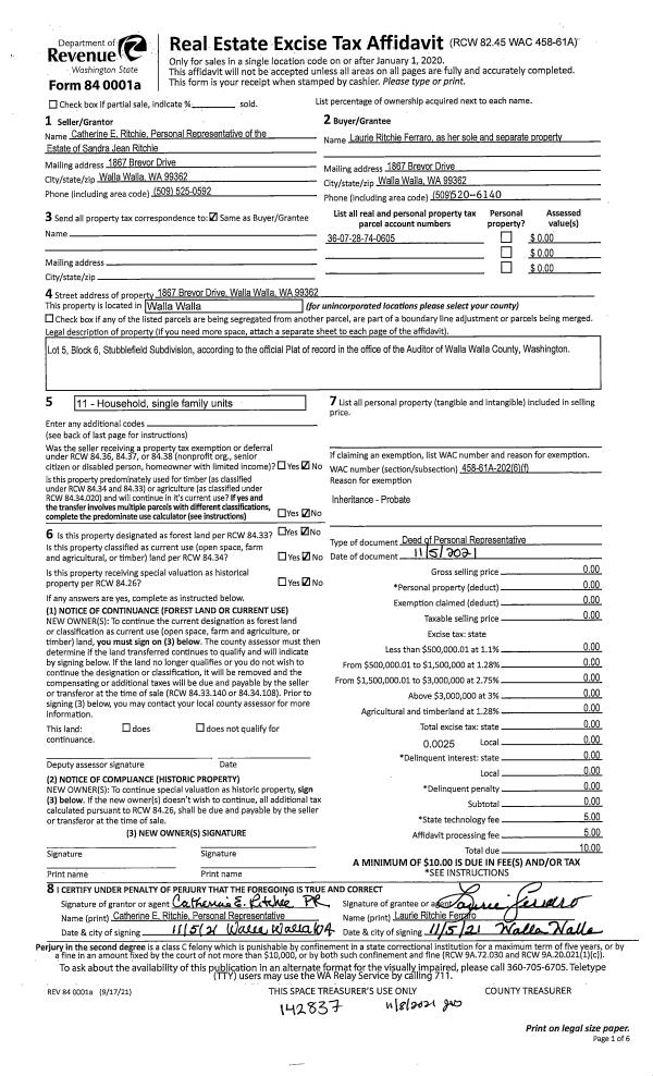 | 1 | 11/08/2021 | DPR | DEED OF PERSONAL REPRESENTATIVE | RITCHIE SANDRA JEAN ESTATE OF | FERRARO LAURIE RITCHIE | | | $0.00 | 142837 | 2021-13379 |
