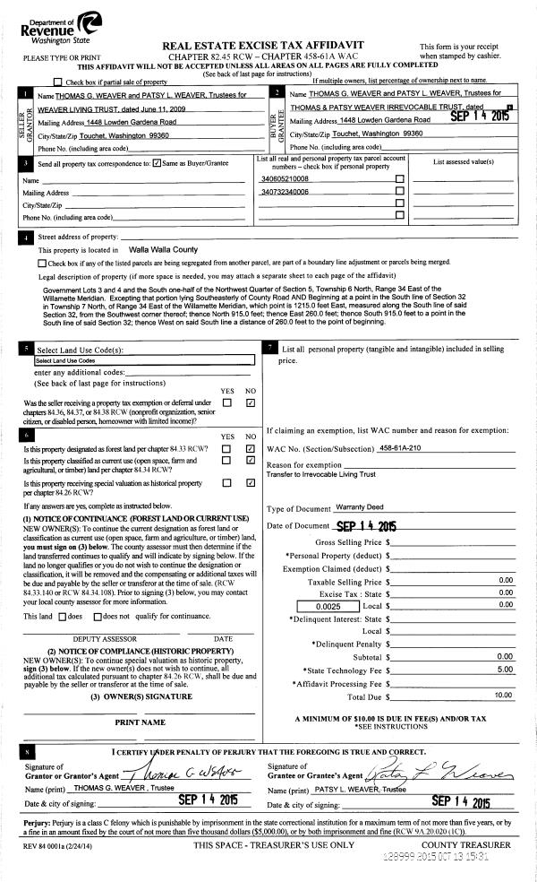 | 2 | 09/14/2015 | WARRANTY D | WARRANTY DEED | WEAVER THOMAS G & PATSY L TRUSTEES | WEAVER THOMAS & PATSY IRREVOCABLE TRUST | 2 PARCELS | | | 128999 | 2015-09495 |