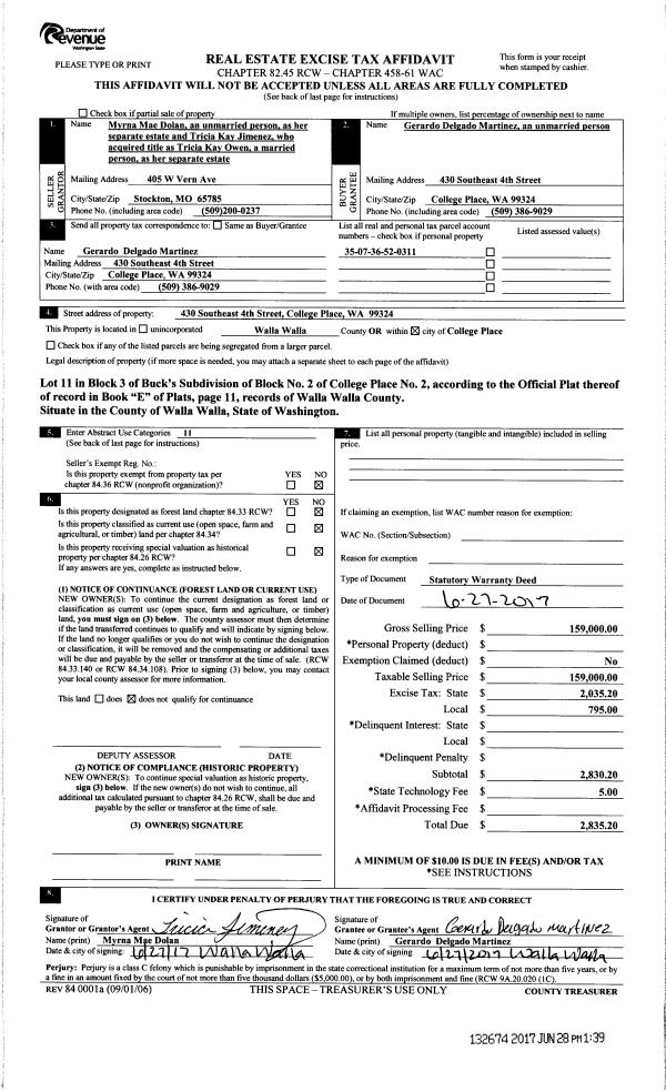 | 1 | 06/28/2017 | SWD | STATUTORY WARRANTY DEED | DOLAN MYRNA MAE | MARTINEZ GERARDO DELGADO | | | $159,000.00 | 132674 | 2017-04953 |