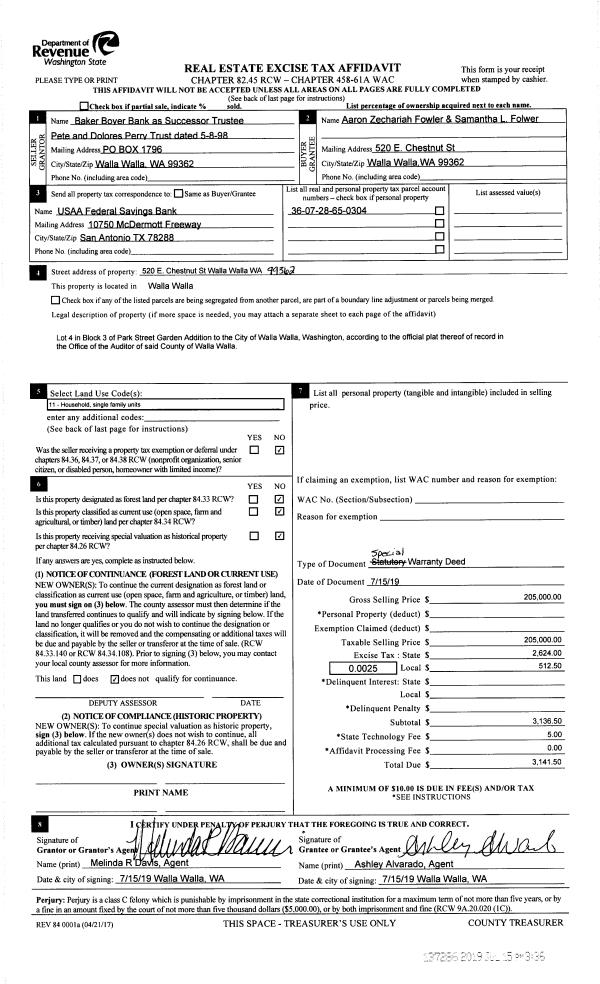 | 2 | 07/15/2019 | SWP | Special Warranty Deed | W W PEERY TRUSTEE PETE & DOLORES PEERY | FOWLER AARON ZECHARIAH & SAMANTHA L | | | $205,000.00 | 137286 | 2019-05135 |