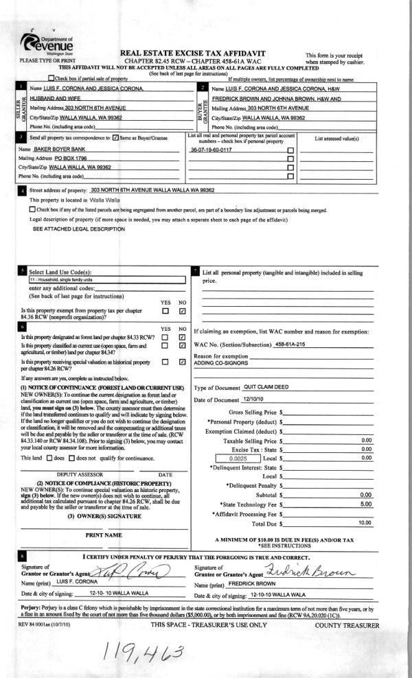 | 3 | 12/15/2010 | QCD | QUIT CLAIM DEED | CORONA, LUIS F & JESSICA | CORONA, LUIS F & JESSICA | | | | 119463 | 2010-10361 |