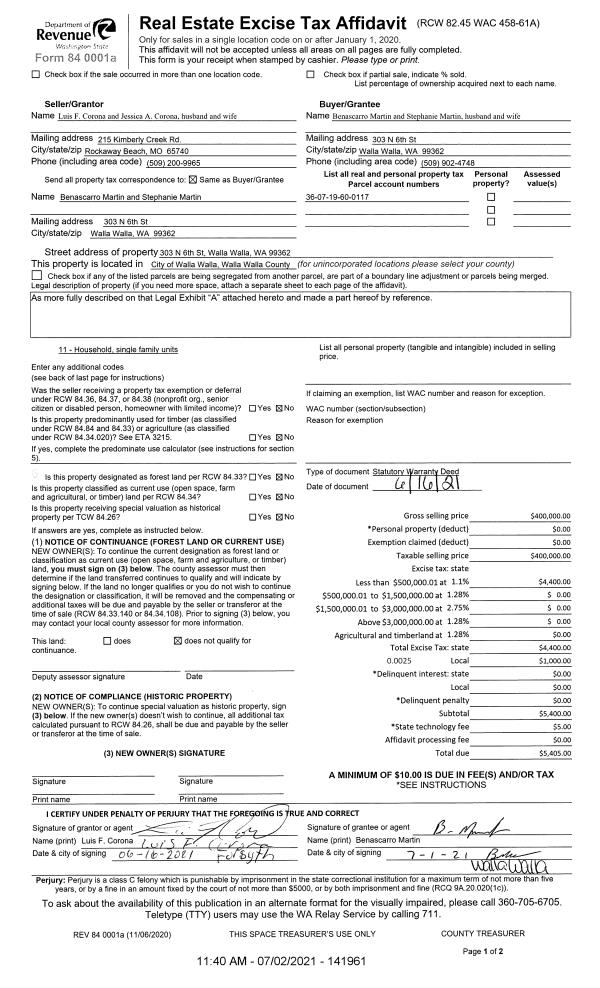 | 1 | 07/02/2021 | SWD | STATUTORY WARRANTY DEED | CORONA LUIS F & JESSICA A | MARTIN STEPHANIE & BENASCARRO | | | $400,000.00 | 141961 | 2021-08074 |