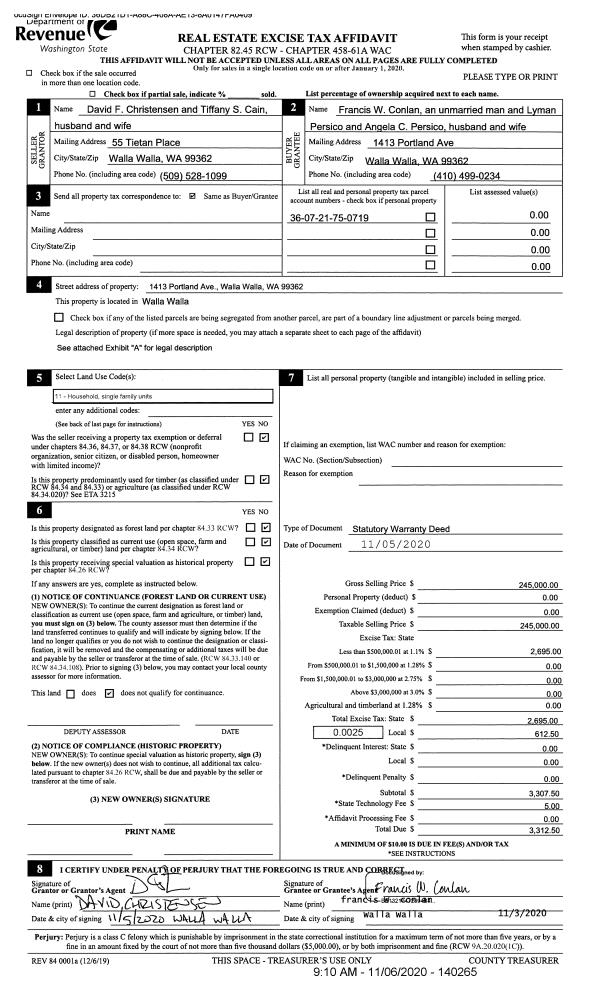 | Mailing Address: | LYMAN & ANGELA C PERSICO 1413 PORTLAND AVE WALLA WALLA, WA 99362 | % Ownership: | 100.0000000000% |