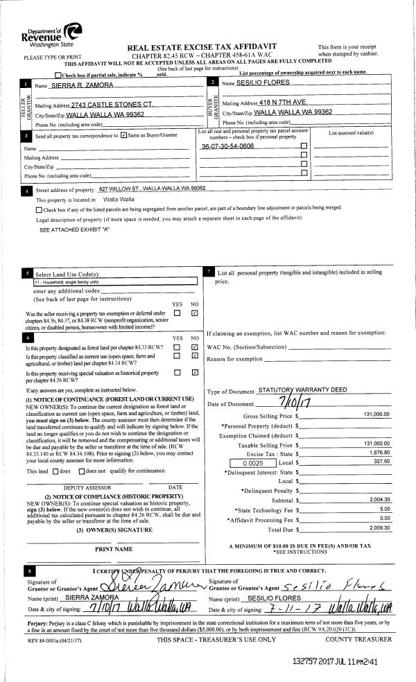 | 2 | 07/11/2017 | SWD | STATUTORY WARRANTY DEED | ZAMORA SIERRA R | FLORES SESILIO | | | $131,000.00 | 132757 | 2017-05307 |