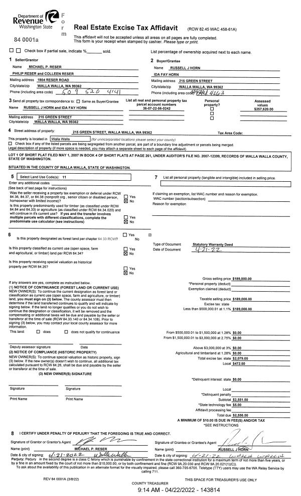 | 1 | 04/22/2022 | SWD | STATUTORY WARRANTY DEED | RESER MICHAEL P | HORN RUSSELL J & IDA FAY | | | $189,000.00 | 143814 | 2022-03430 |