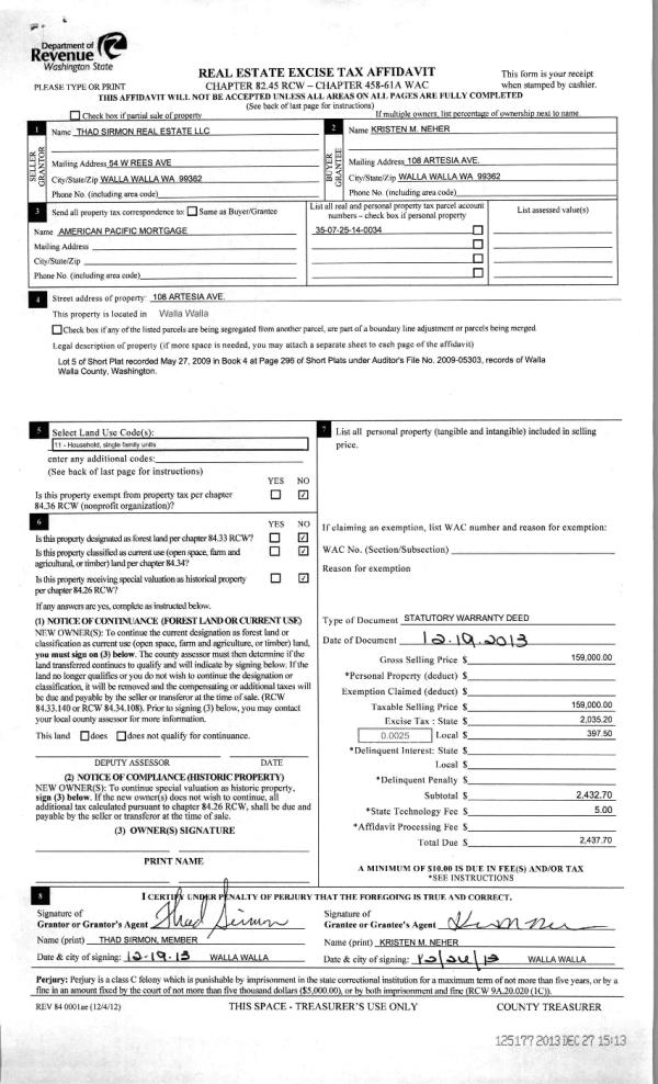 | 3 | 12/27/2013 | WARRANTY D | WARRANTY DEED | SIRMON THAD REAL ESTATE LLC | WEST KRISTEN M | | | $159,000.00 | 125177 | 2013-12292 |