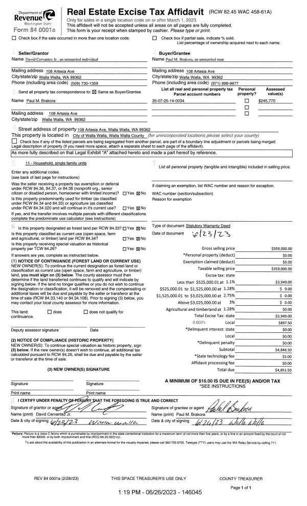| 1 | 06/26/2023 | SWD | STATUTORY WARRANTY DEED | CERVANTEZ DAVID JR | BRAKORA PAUL M | | | $359,000.00 | 146045 | 2023-03531 |