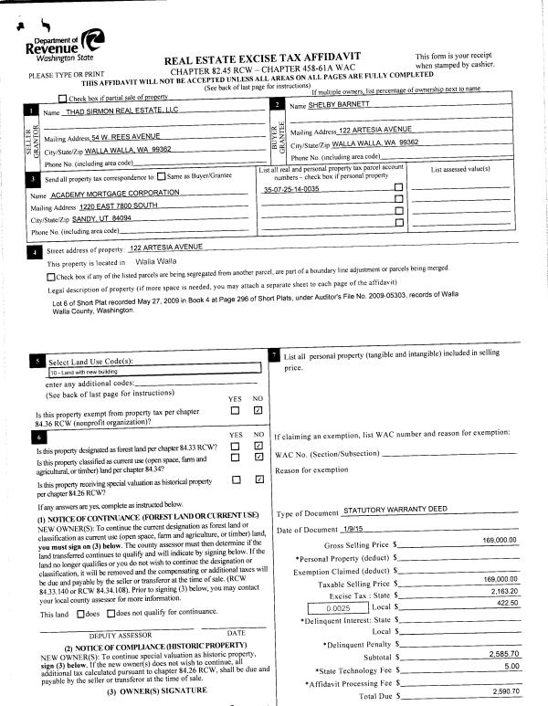 | 2 | 01/09/2015 | SWD | STATUTORY WARRANTY DEED | SIRMON THAD REAL ESTATE LLC | BARNETT SHELBY | | | $169,000.00 | 127243 | 2015-00215 |