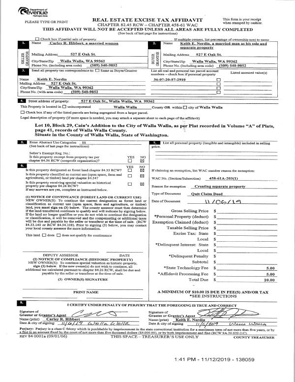 | 2 | 11/06/2019 | QCD | QUIT CLAIM DEED | NERDIN KEITH E | NERDIN KEITH E | | | $0.00 | 138059 | 2019-09290 |
