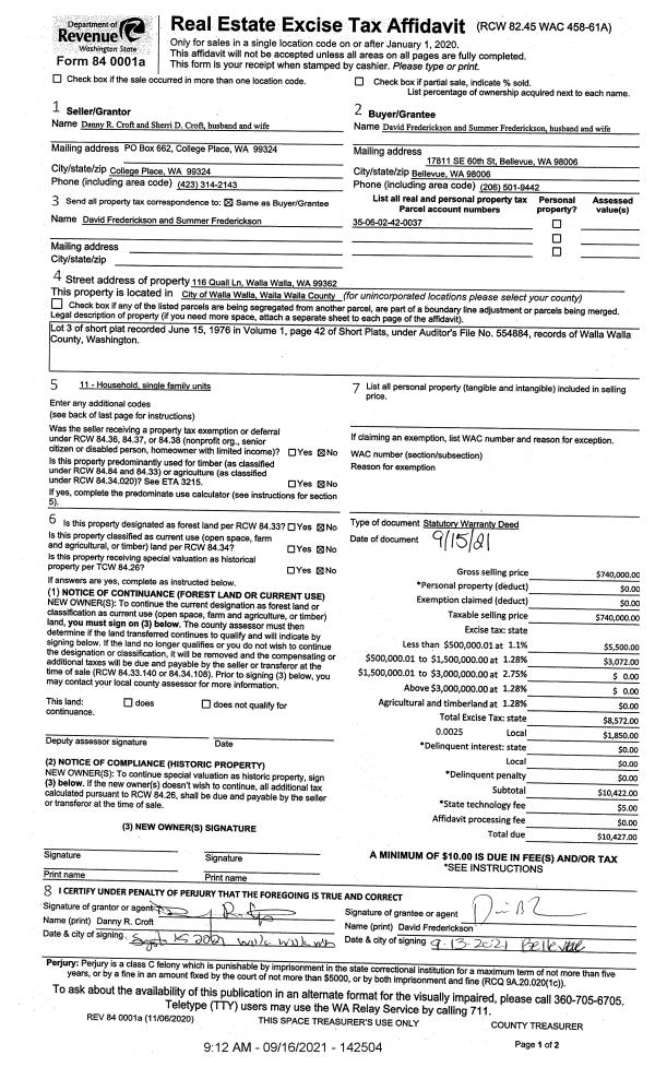 | 1 | 09/16/2021 | SWD | STATUTORY WARRANTY DEED | CROFT DANNY R & SHERRI D | FREDERICKSON DAVID & SUMMER | | | $740,000.00 | 142504 | 2021-11410 |