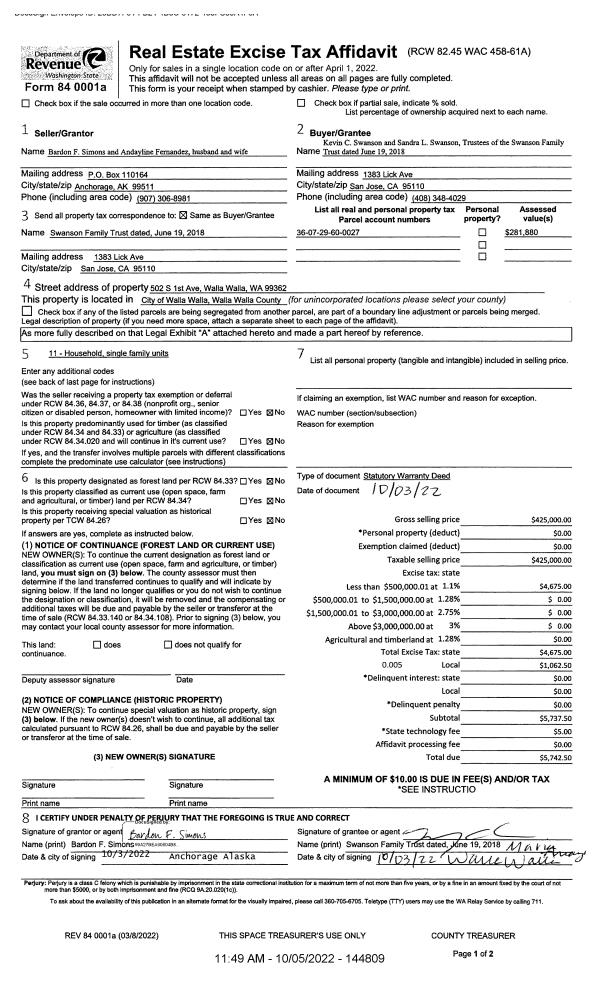 | 2 | 10/05/2022 | SWD | STATUTORY WARRANTY DEED | SIMONS BARDON F | SWANSON FAMILY TRUST | | | $425,000.00 | 144809 | 2022-08222 |