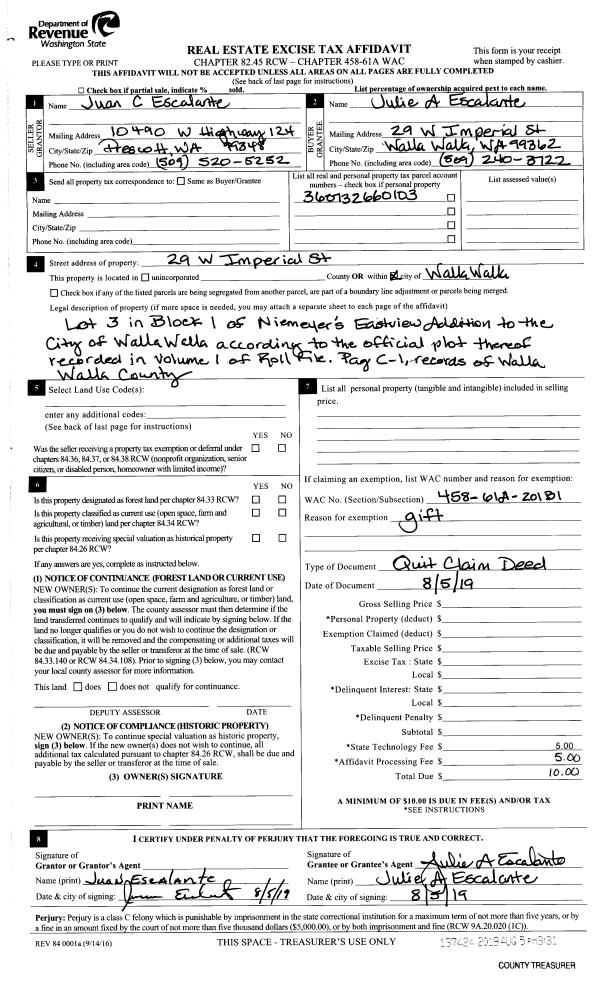 | 2 | 08/05/2019 | QCD | QUIT CLAIM DEED | ESCALANTE JUAN C | ESCALANTE JULIE A | | | $0.00 | 137424 | 2019-05795 |