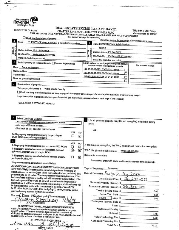 | 1 | 12/08/2014 | EASE | EASEMENT | WALLA WALLA CITY OF | BONNEVILLE POWER ADMINISTRATION | | 6-PARCELS | $36,200.00 | 127068 | 2014-08872 |