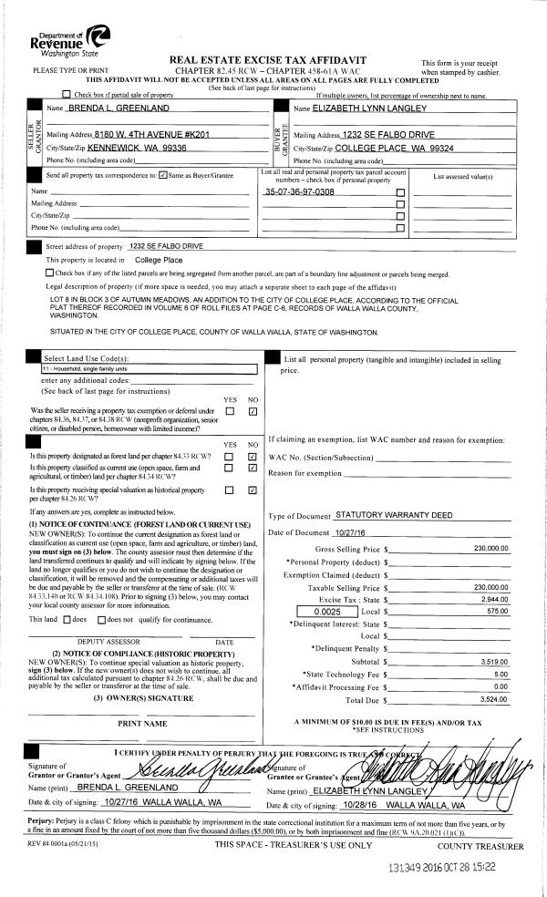 | 2 | 10/28/2016 | SWD | STATUTORY WARRANTY DEED | GREENLAND BRENDA | LANGLEY ELIZABETH LYNN | | | $230,000.00 | 131349 | 2016-08973 |
