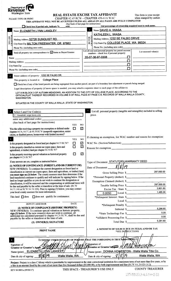 | 1 | 08/09/2019 | SWD | STATUTORY WARRANTY DEED | LANGLEY ELIZABETH LYNN | IWASA DAVID A & KATHLEEN L | | | $297,000.00 | 137455 | 2019-05970 |