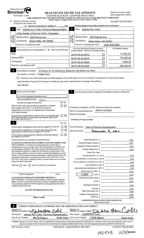 | 1 | 12/03/2020 | DPR | DEED OF PERSONAL REPRESENTATIVE | ARBINI NORMAN | COBB DEBBIE ANN | | | | 140478 | 2020-12779 |