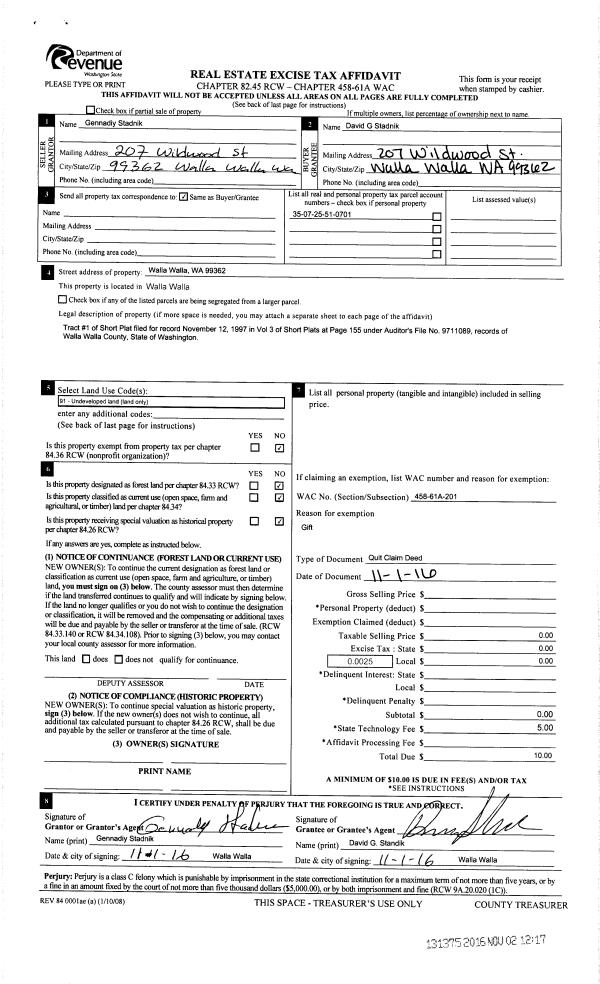 | 1 | 11/01/2016 | QCD | QUIT CLAIM DEED | STADNIK GENNADIY | STADNIK DAVID G | | | | 131375 | 2016-09096 |