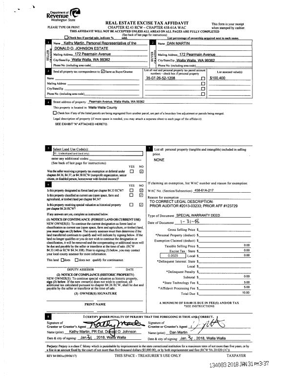 | 2 | 01/31/2018 | SWP | Special Warranty Deed | JOHNSON DONALD O | MARTIN DAN | | | $0.00 | 134083 | 2018-00875 |