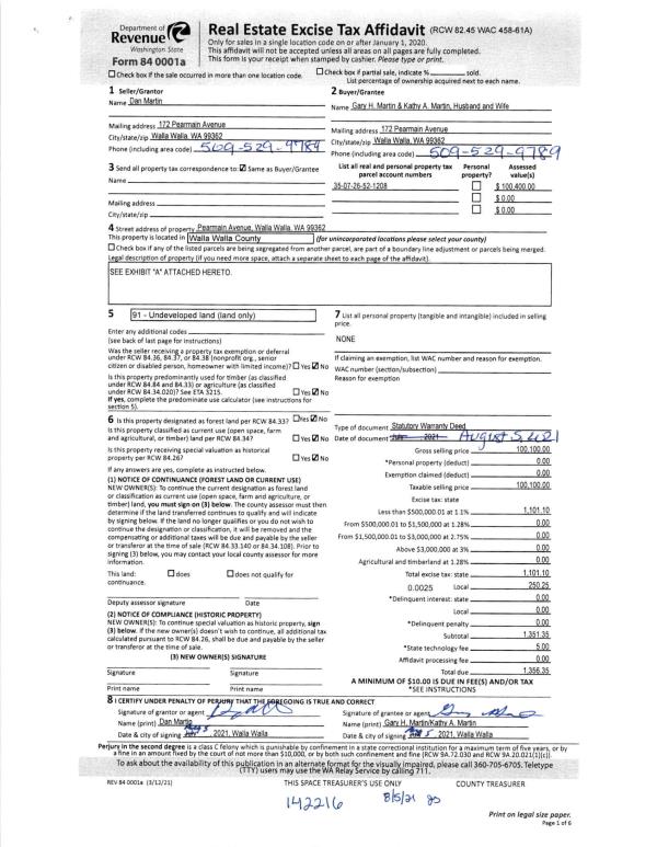 | 1 | 08/05/2021 | SWD | STATUTORY WARRANTY DEED | MARTIN DAN | MARTIN GARY H & KATHY A | | | $100,100.00 | 142216 | 2021-09538 |