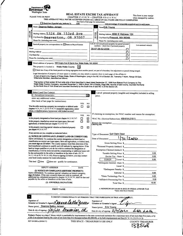 | 2 | 04/28/2017 | QCD | QUIT CLAIM DEED | BNSF RAILWAY COMPANY | YOUNG ERIK A | | | $4,300.00 | 132279 | 2017-03154 |