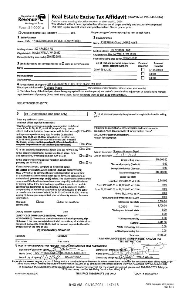 | 1 | 04/17/2024 | SWD | STATUTORY WARRANTY DEED | BLACKWELDER TIMOTHY & LOIS | HAYS JOSEPH & LINNAE | | | $340,000.00 | 147418 | 2024-01955 |