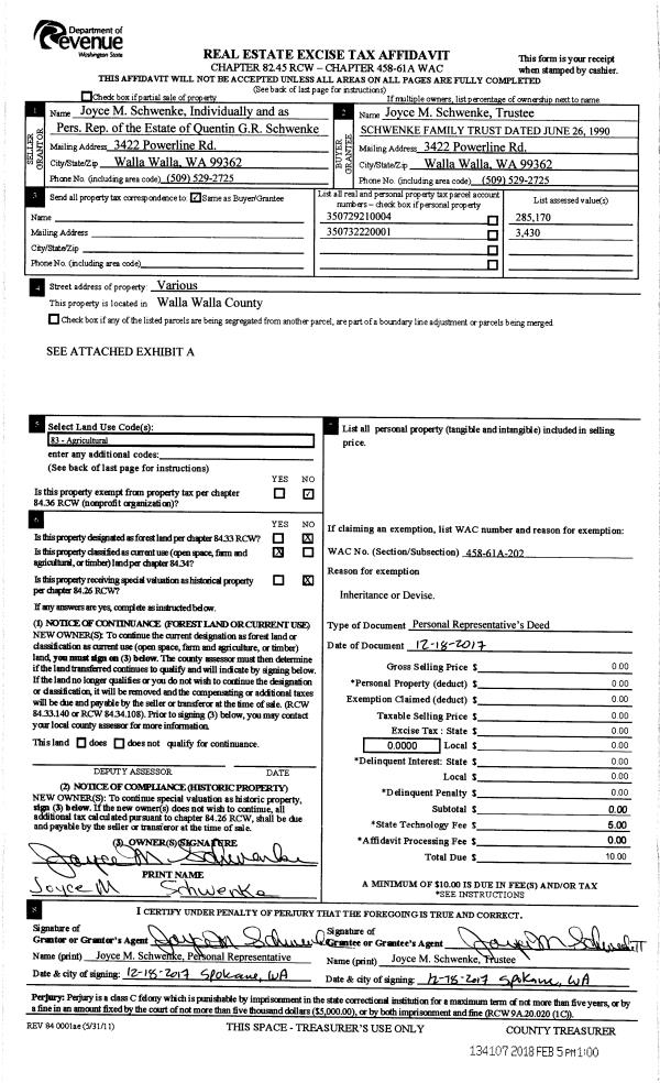 | 1 | 12/18/2017 | DPR | DEED OF PERSONAL REPRESENTATIVE | SCHWENKE QUENTIN & JOYCE | SCHWENKE FAMILY TRUST | | | $0.00 | 134107 | 2018-00986 |