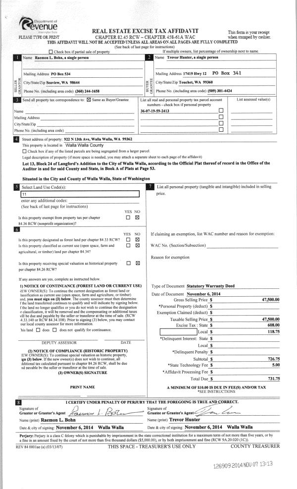 | 1 | 11/07/2014 | SWD | STATUTORY WARRANTY DEED | BOHN RAEMON L | HUNTER TREVOR | | | $47,500.00 | 126909 | 2014-08123 |