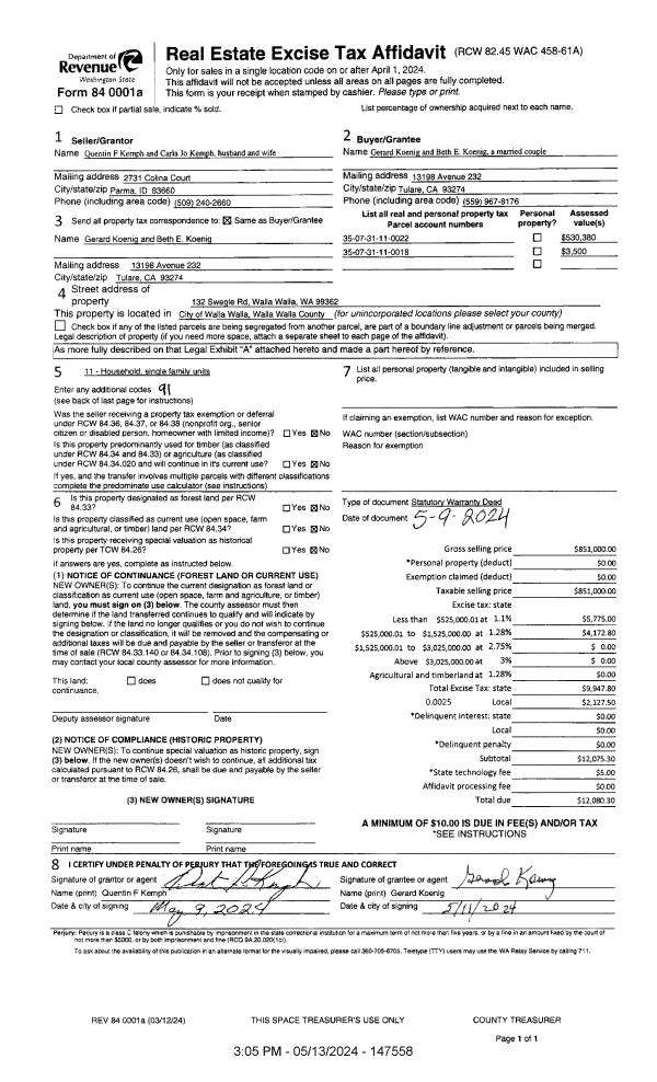 | 1 | 05/13/2024 | SWD | STATUTORY WARRANTY DEED | KEMPH QUENTIN F & CARLA J | KOENIG GERARD & BETH E | | 2-PARCELS | $851,000.00 | 147558 | 2024-02549 |