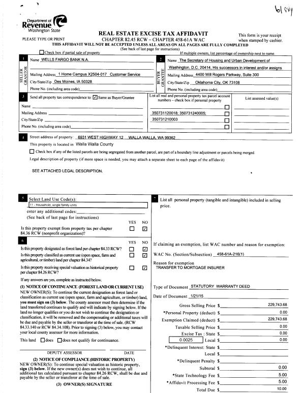 | 4 | 01/29/2015 | SWD | STATUTORY WARRANTY DEED | WELLS FARGO BANK NA | SECRETARY OF HOUSING & URBAN DEV | | 3-PARCELS | $229,743.00 | 127347 | 2015-00779 |
