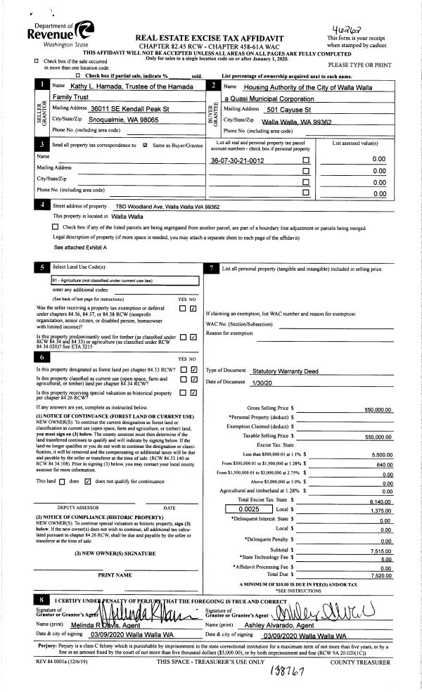 | 1 | 03/10/2020 | SWD | STATUTORY WARRANTY DEED | HAMADA FAMILY TRUST | HOUSING AUTHORITY OF THE | | | $550,000.00 | 138767 | 2020-02192 |