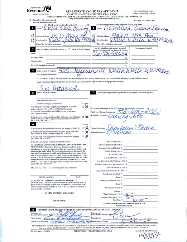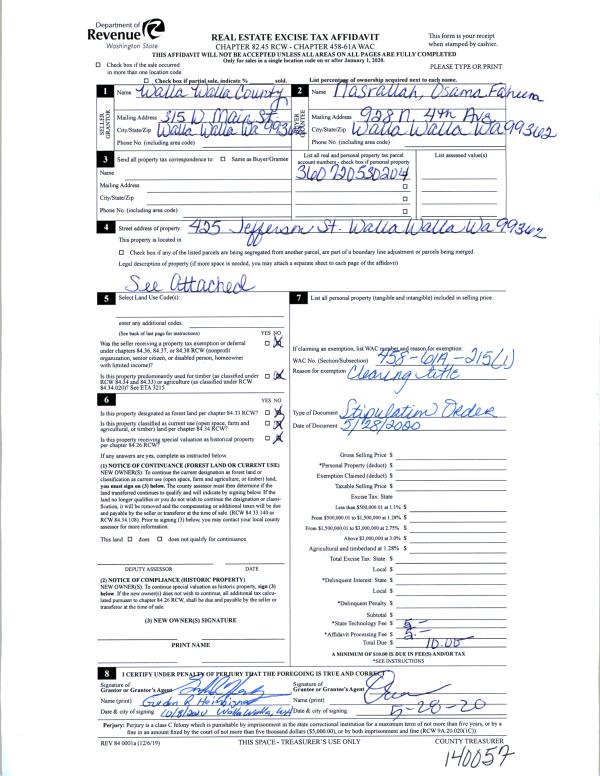 | 2 | 02/11/2020 | TAX AFF | TAX AFFIDAVIT | NASRALLAH OSAMA FAHEEM | WALLA WALLA COUNTY OF | | | $0.00 | 138674 | 2020-01697 |