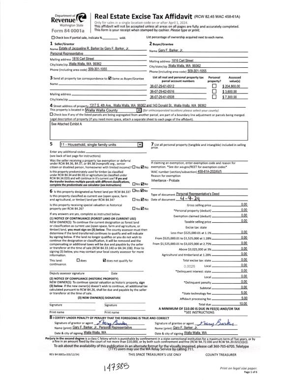 | 1 | 04/12/2024 | DPR | DEED OF PERSONAL REPRESENTATIVE | BARKER JACQUELINE R ESTATE OF | BARKER GARY F JR | | | | 147385 | 2024-01807 |