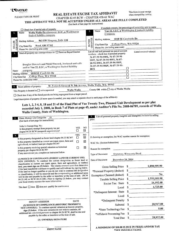 | 2 | 01/05/2015 | SWD | STATUTORY WARRANTY DEED | WALLA WALLA DEVELOPMENT LLC | VUE 22 LLC | | 7-PARCELS | | 127219 | 2015-00068 |