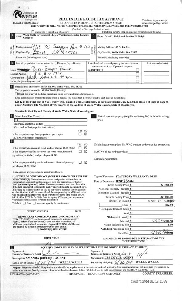 | 1 | 07/18/2014 | SWD | STATUTORY WARRANTY DEED | WALLA WALLA DEVELOPMENT LLC | ROLPH DAVID L & JENNIFER D | | | $321,000.00 | 126271 | 2014-05030 |