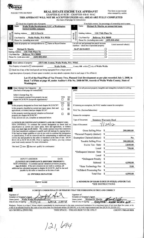 | 1 | 04/20/2012 | WARRANTY D | WARRANTY DEED | WALLA WALLA DEVELOPMENT LLC | MARTIN, MICHAEL D | | | $300,000.00 | 121694 | 2012-03201 |