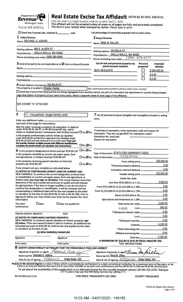 | 1 | 04/07/2025 | SWD | STATUTORY WARRANTY DEED | ADKINS RACHAEL G | DILLON NINA M | | | $320,000.00 | 149182 | 2025-01799 |