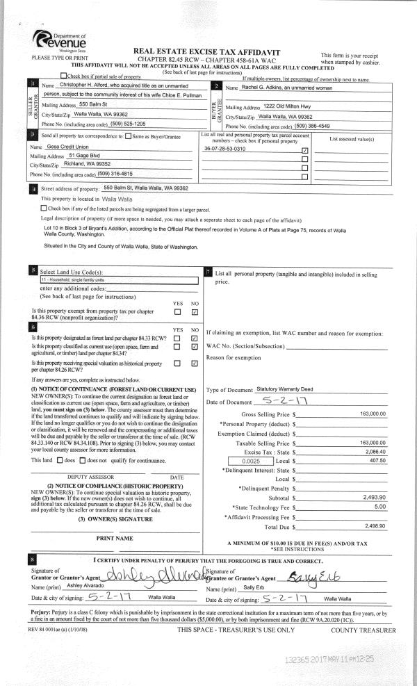 | 2 | 05/11/2017 | SWD | STATUTORY WARRANTY DEED | ALFORD CHRISTOPHER H | ADKINS RACHAEL G | | | $163,000.00 | 132365 | 2017-03552 |