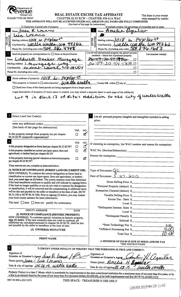 | 6 | 05/28/2015 | QCD | QUIT CLAIM DEED | LOZANO JUAN RICARDO & LISA | AGUILAR AMELIA H | | | | 128058 | 2015-04530 |