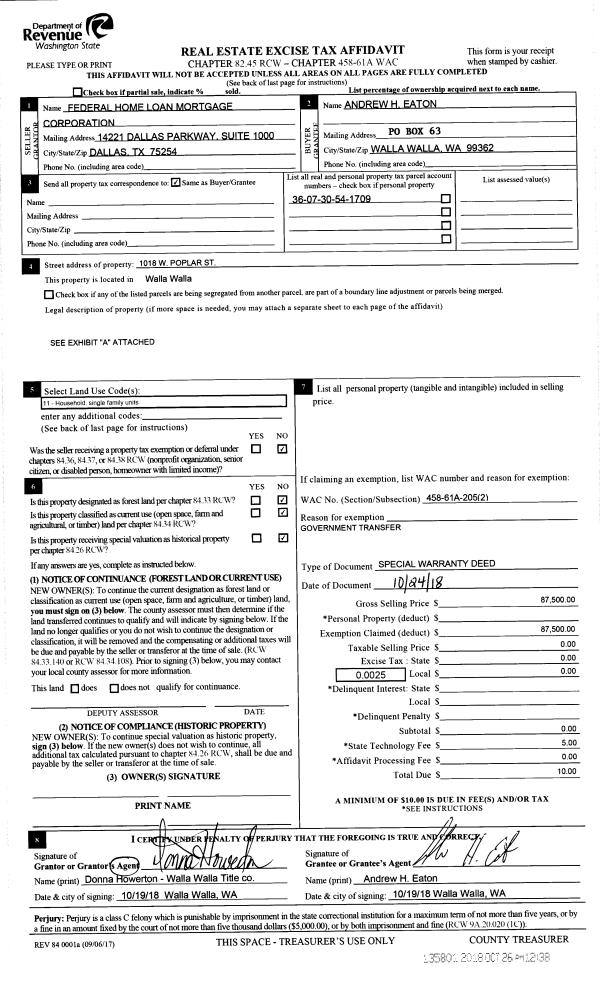 | 3 | 10/26/2018 | SWP | Special Warranty Deed | FEDERAL HOME LOAN MORTGAGE CORPORATION | EATON ANDREW H | | | $87,500.00 | 135801 | 2018-08855 |