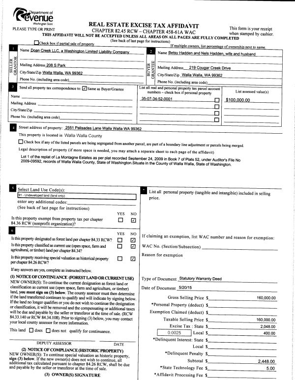 | 3 | 05/20/2015 | SWD | STATUTORY WARRANTY DEED | DOAN CREEK LLC | HADDEN NELS & BETSY | | | $160,000.00 | 128019 | 2015-04293 |