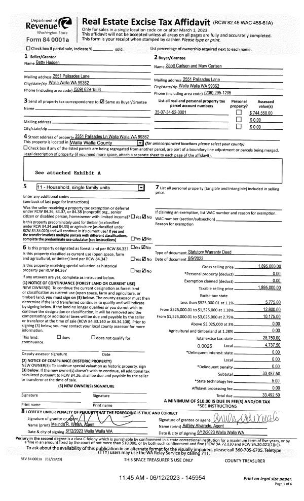 | 1 | 06/12/2023 | SWD | STATUTORY WARRANTY DEED | HADDEN BETTY | CARLSEN SCOTT & MARY | | | $1,895,000.00 | 145954 | 2023-03207 |