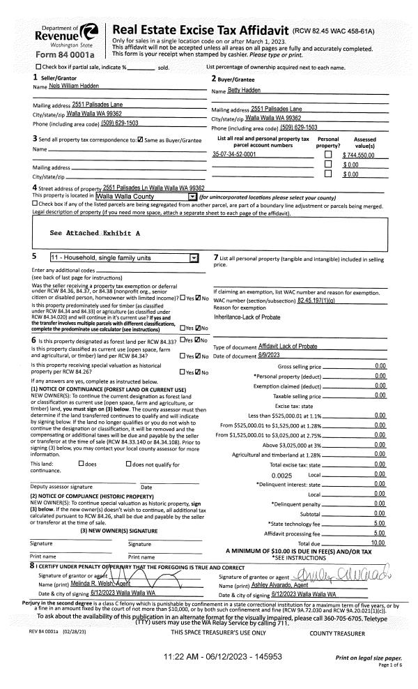 | 2 | 06/12/2023 | LOPA | LACK OF PROBATE AFFIDAVIT | HADDEN NELS & BETSY | HADDEN BETTY | | | | 145953 | 2023-03206 |
