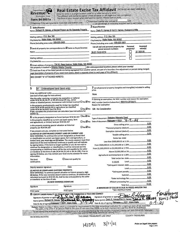 | 2 | 03/09/2021 | SWD | STATUTORY WARRANTY DEED | HARVEY RICHARD W | HARVEY DARIN R | | | $0.00 | 141091 | 2021-02837 |