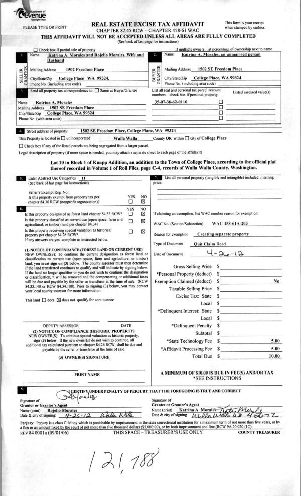 | 2 | 05/10/2012 | QCD | QUIT CLAIM DEED | MORALES, KATRINA ANN | MORALES, KATRINA A | | | | 121788 | 2012-03804 |