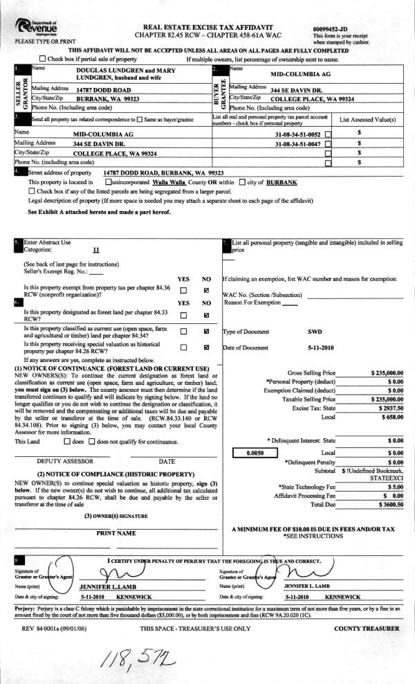 | 5 | 06/03/2010 | WARRANTY D | WARRANTY DEED | LUNDGREN DOUGLAS B & MARY A | MID-COLUMBIA AG | | | | 118572 | 2010-04294 |