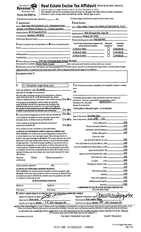 | Mailing Address: | 14787 DODD RD BURBANK, WA 99323 | % Ownership: | 100.0000000000% |