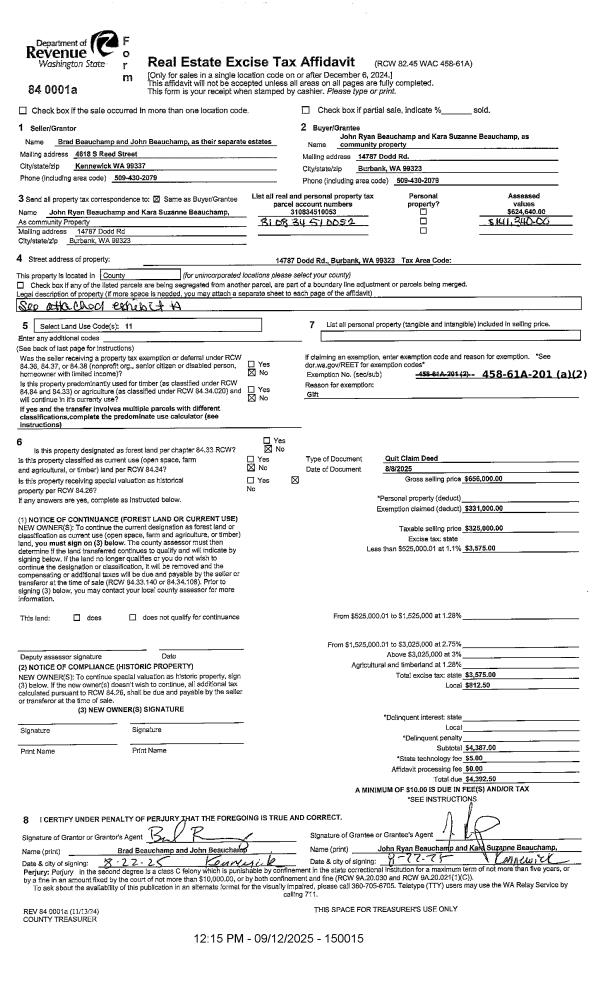 | 1 | 09/12/2025 | QCD | QUIT CLAIM DEED | BEAUCHAMP BRAD | BEAUCHAMP JOHN RYAN & KARA SUZANNE | | | | 150015 | 2025-05534 |
