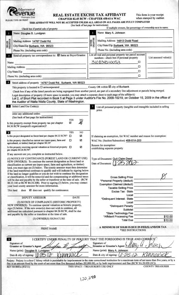 | 9 | 06/29/2012 | QCD | QUIT CLAIM DEED | LUNDGREN, DOUGLAS | JOHNSON, MARY A | | | $0.00 | 122270 | 2012-05479 |