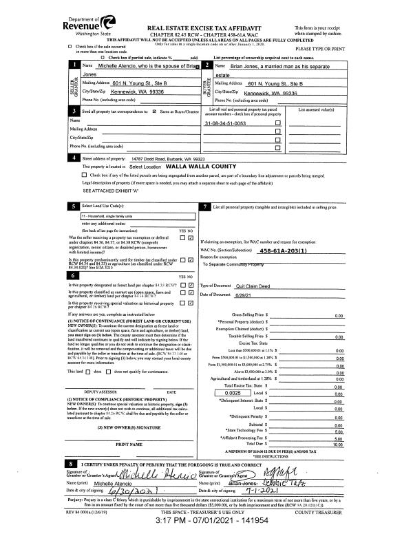 | 7 | 06/29/2021 | QCD | QUIT CLAIM DEED | ATENCIO MICHELLE | JONES BRIAN | | | $0.00 | 141954 | 2021-08039 |